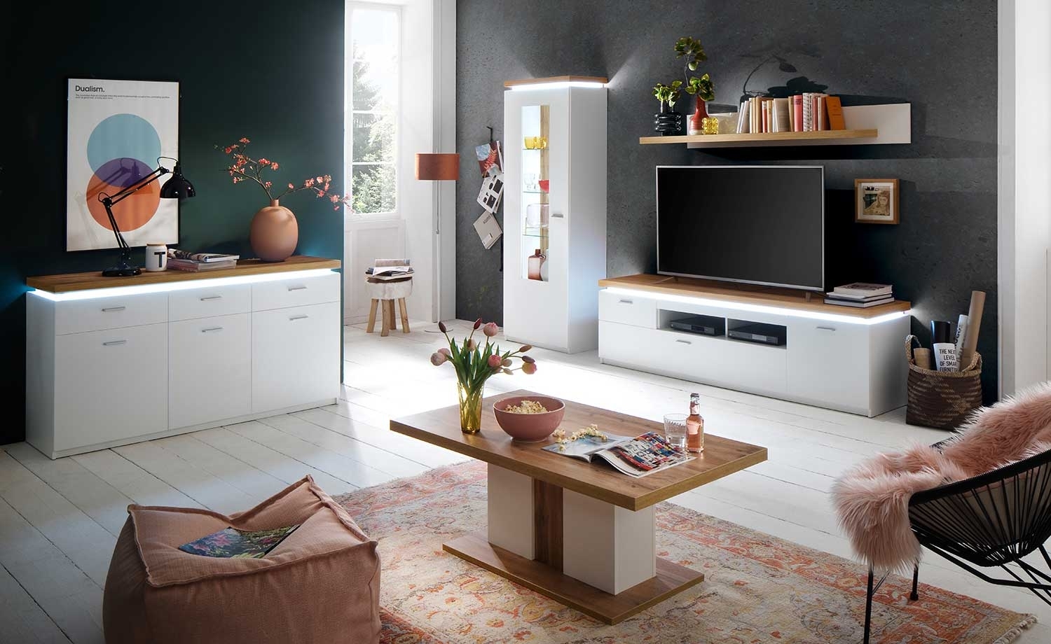 | Lieferumfang: | 3-tlg. Wohnwand: 1 Lowboard, 1 Vitrinenschrank und 1 Wandboard. Die Oberplattenbeleuchtungen sind enthalten. LED-Glaskantenbeleuchtungen sind nicht enthalten |