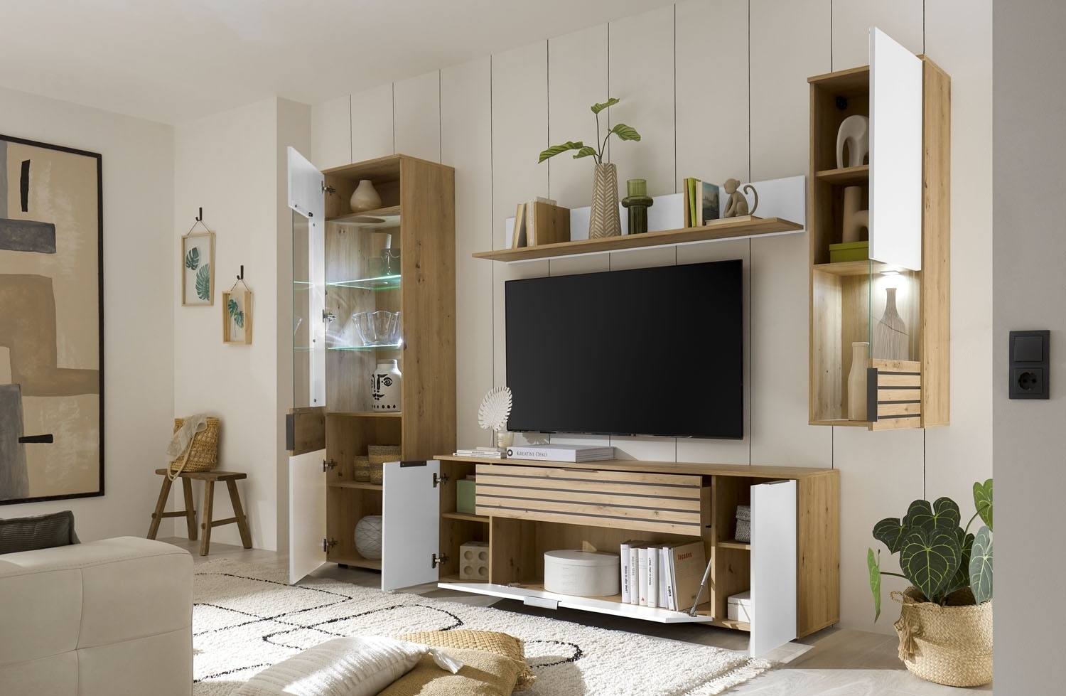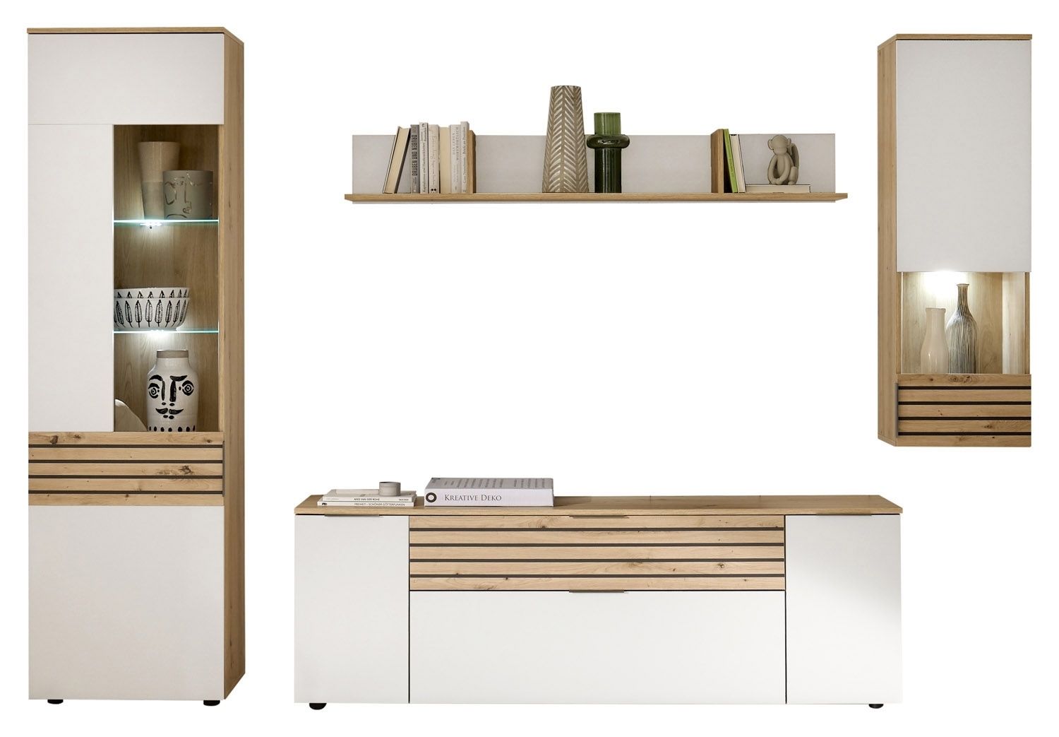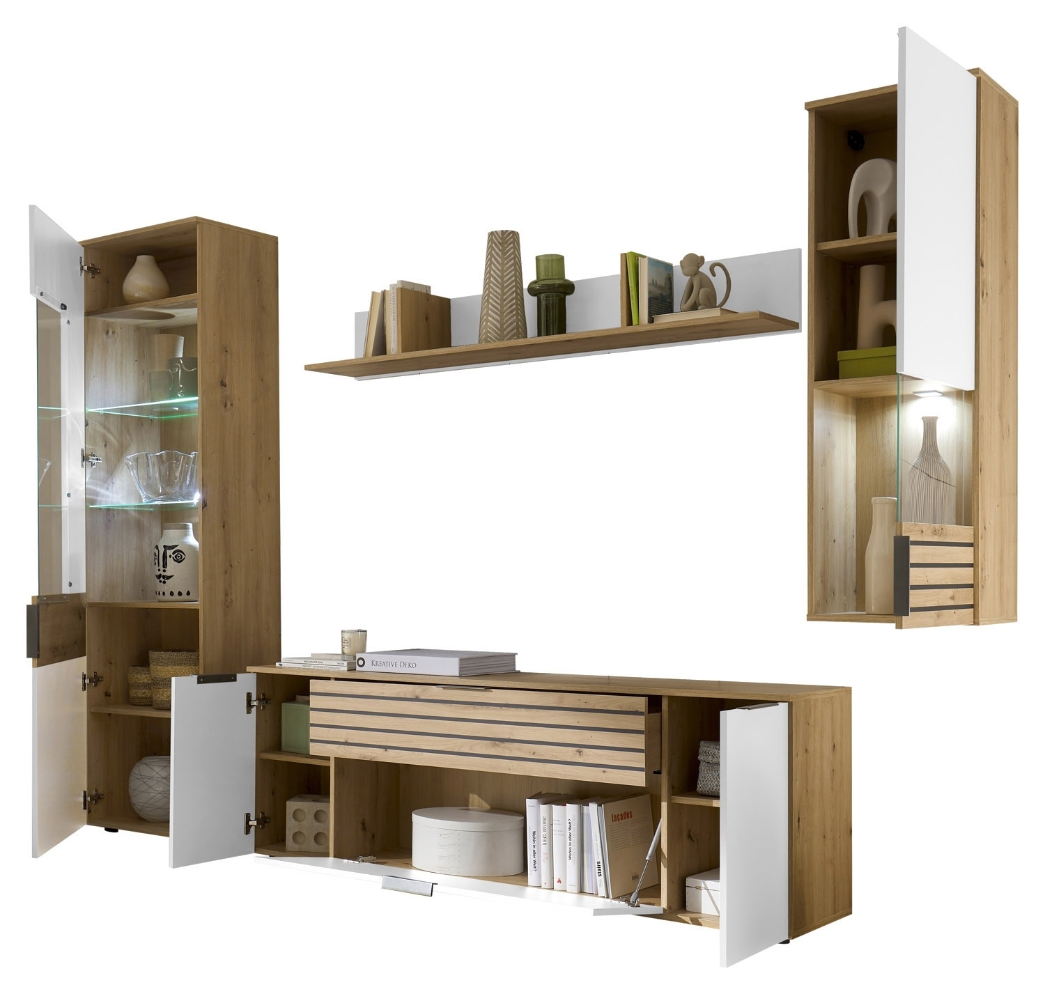 Die 4-teilige Wohnwand, bestehend aus einem TV Lowboard, einer Vitrine, einem Hängeschrank und einem Wandboard, bietet eine komplette Lösung für Ihr Wohnzimmer. In den Farben Braun und Weiß gehalten, fügt sie sich harmonisch ins Ambiente ein. Mit einer imposanten Breite von 265 cm, einer Höhe von 199 cm und einer Tiefe von 37 cm schafft sie einen eindrucksvollen Blickfang. Die Kombination aus Glas und Holzwerkstoff, veredelt mit Artisan Eiche Dekor und mattem Weiß, verleiht der Wohnwand eine zeitgemäße Ästhetik. Die enthaltene LED-Beleuchtung setzt zudem stilvolle Akzente.