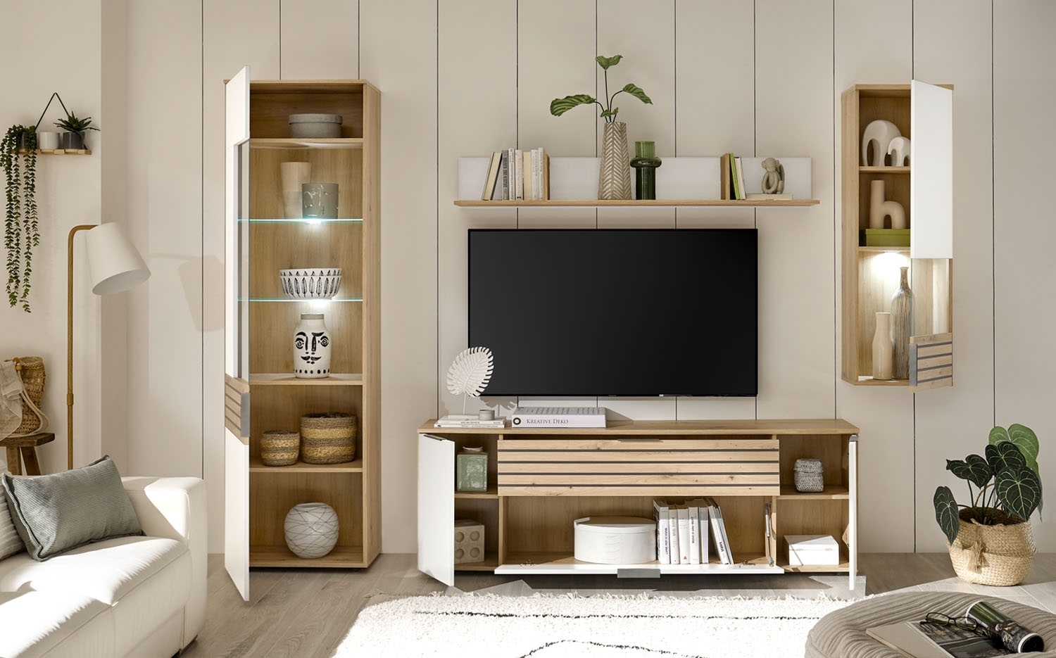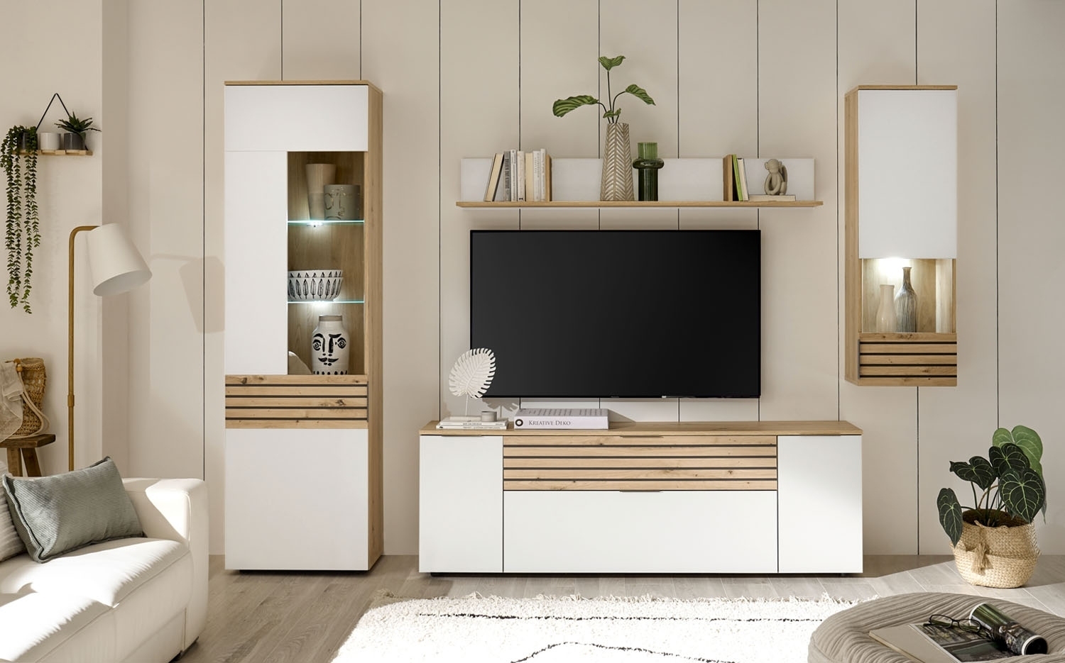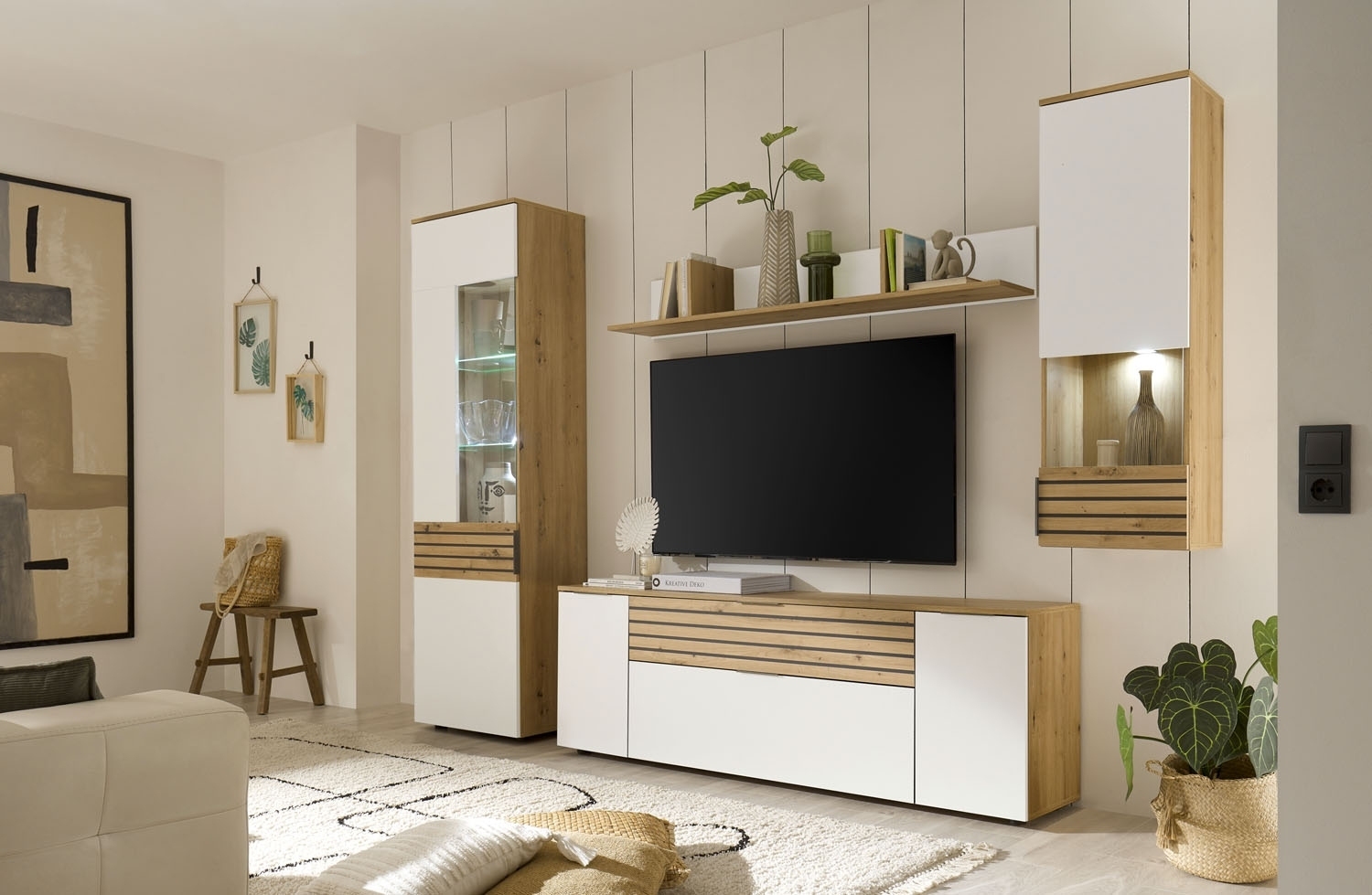 Die 4-teilige Wohnwand, bestehend aus einem TV Lowboard, einer Vitrine, einem Hängeschrank und einem Wandboard, bietet eine komplette Lösung für Ihr Wohnzimmer. In den Farben Braun und Weiß gehalten, fügt sie sich harmonisch ins Ambiente ein. Mit einer imposanten Breite von 265 cm, einer Höhe von 199 cm und einer Tiefe von 37 cm schafft sie einen eindrucksvollen Blickfang. Die Kombination aus Glas und Holzwerkstoff, veredelt mit Artisan Eiche Dekor und mattem Weiß, verleiht der Wohnwand eine zeitgemäße Ästhetik. Die enthaltene LED-Beleuchtung setzt zudem stilvolle Akzente.