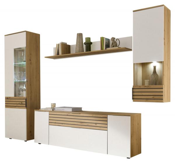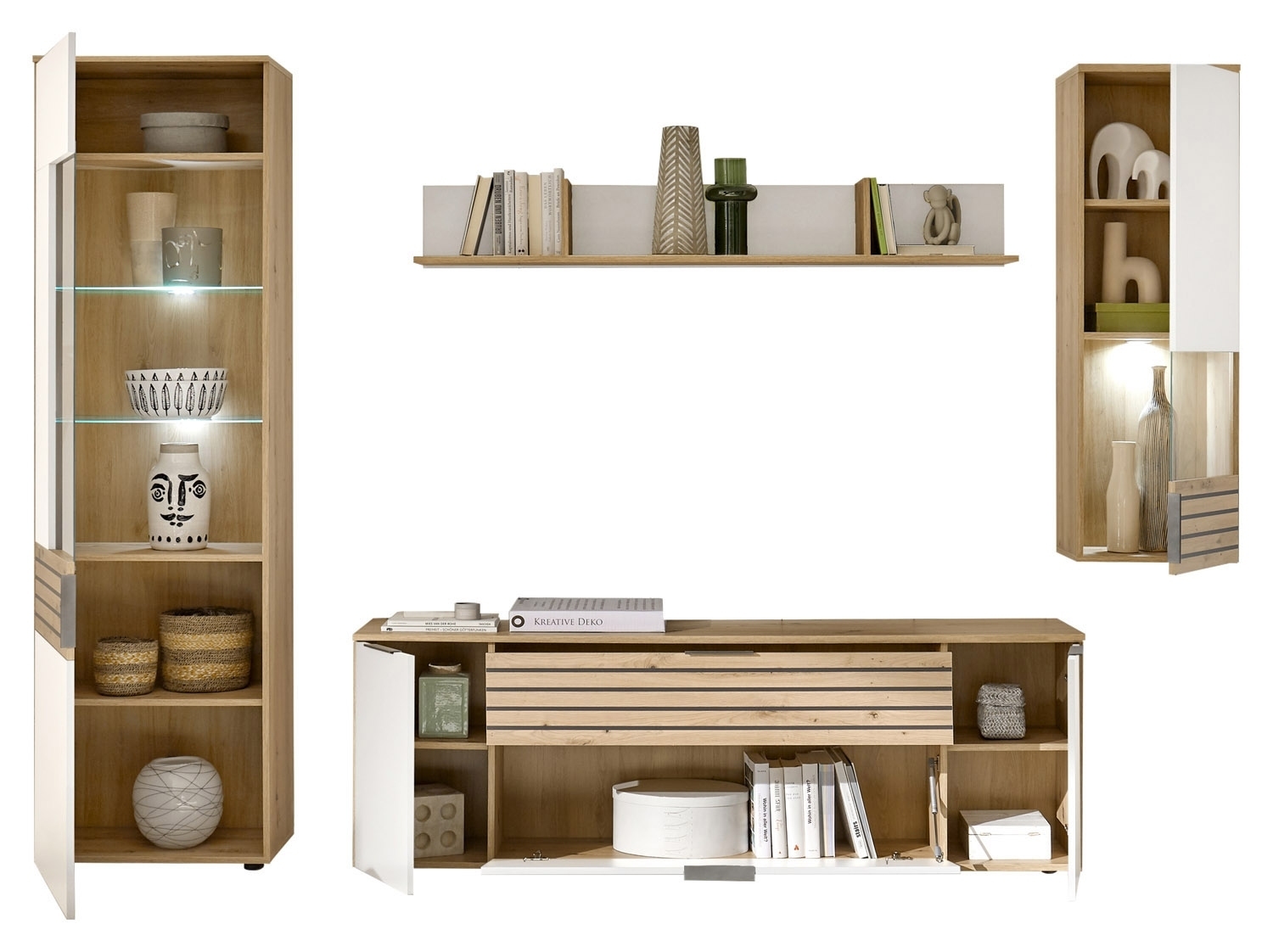 Lieferumfang: 4-teilige Wohnwand: 1 TV Lowboard, 1 Vitrine, 1 Hängeschrank und 1 Wandboard. Die LED-Beleuchtung ist enthalten