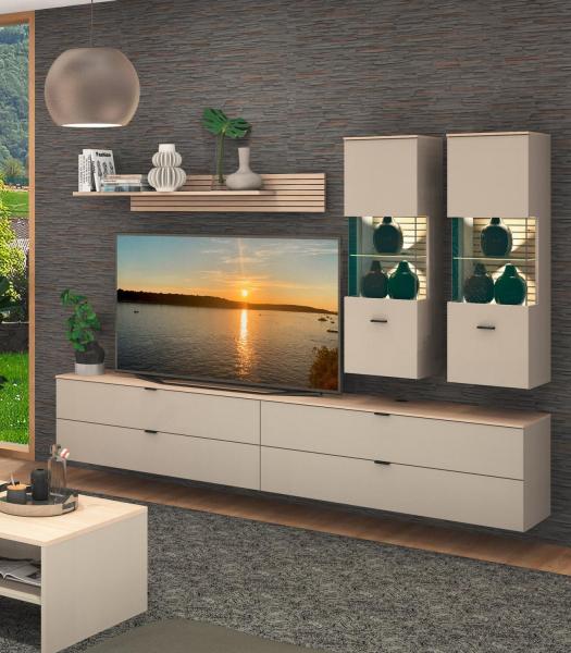 | Lieferumfang: | 5-teilige Wohnwand: 2 TV Lowboards, 2 Hängeschränke und 1 Wandboard. Die LED-Beleuchtung ist enthalten |