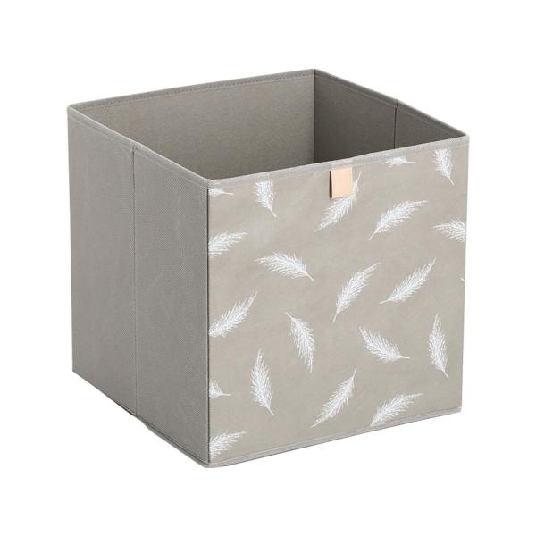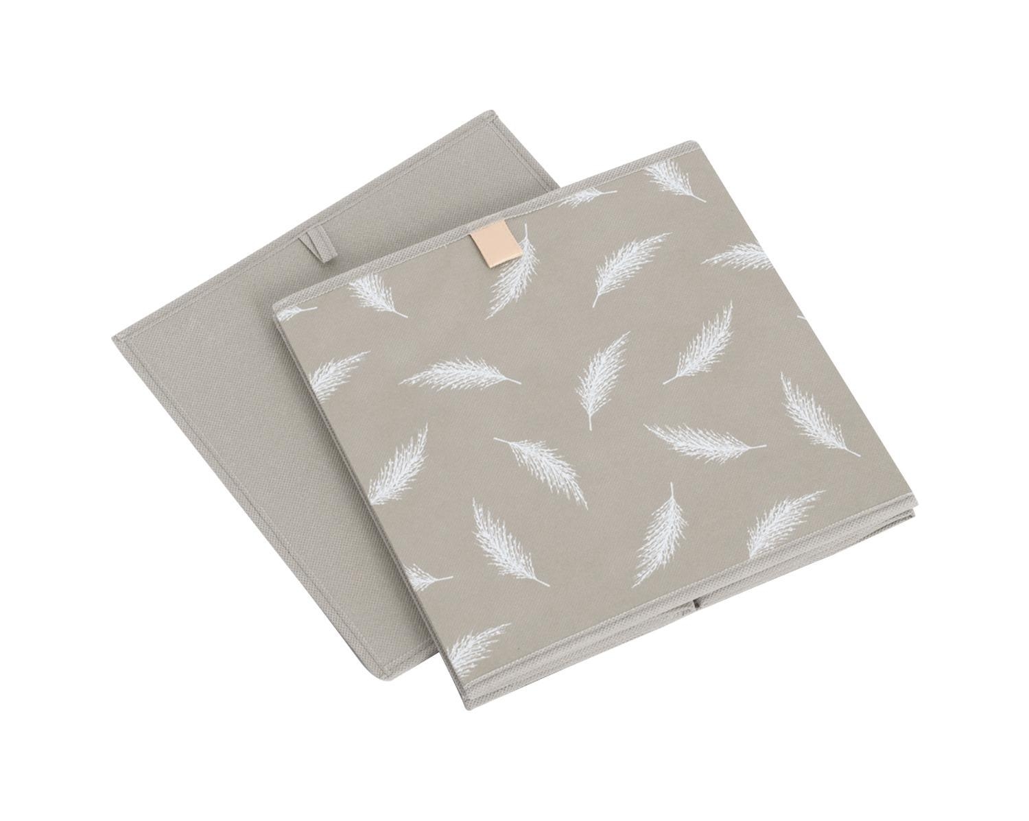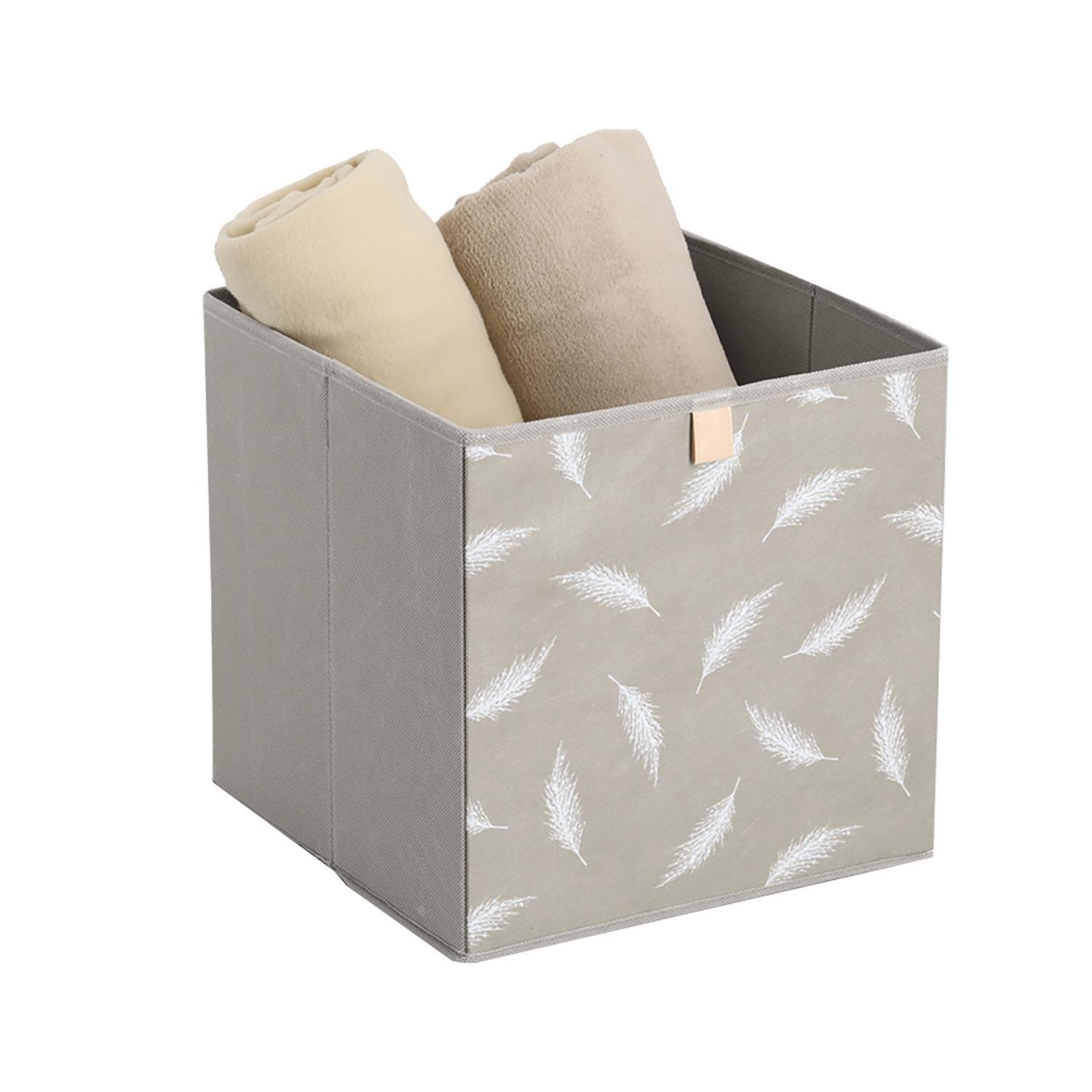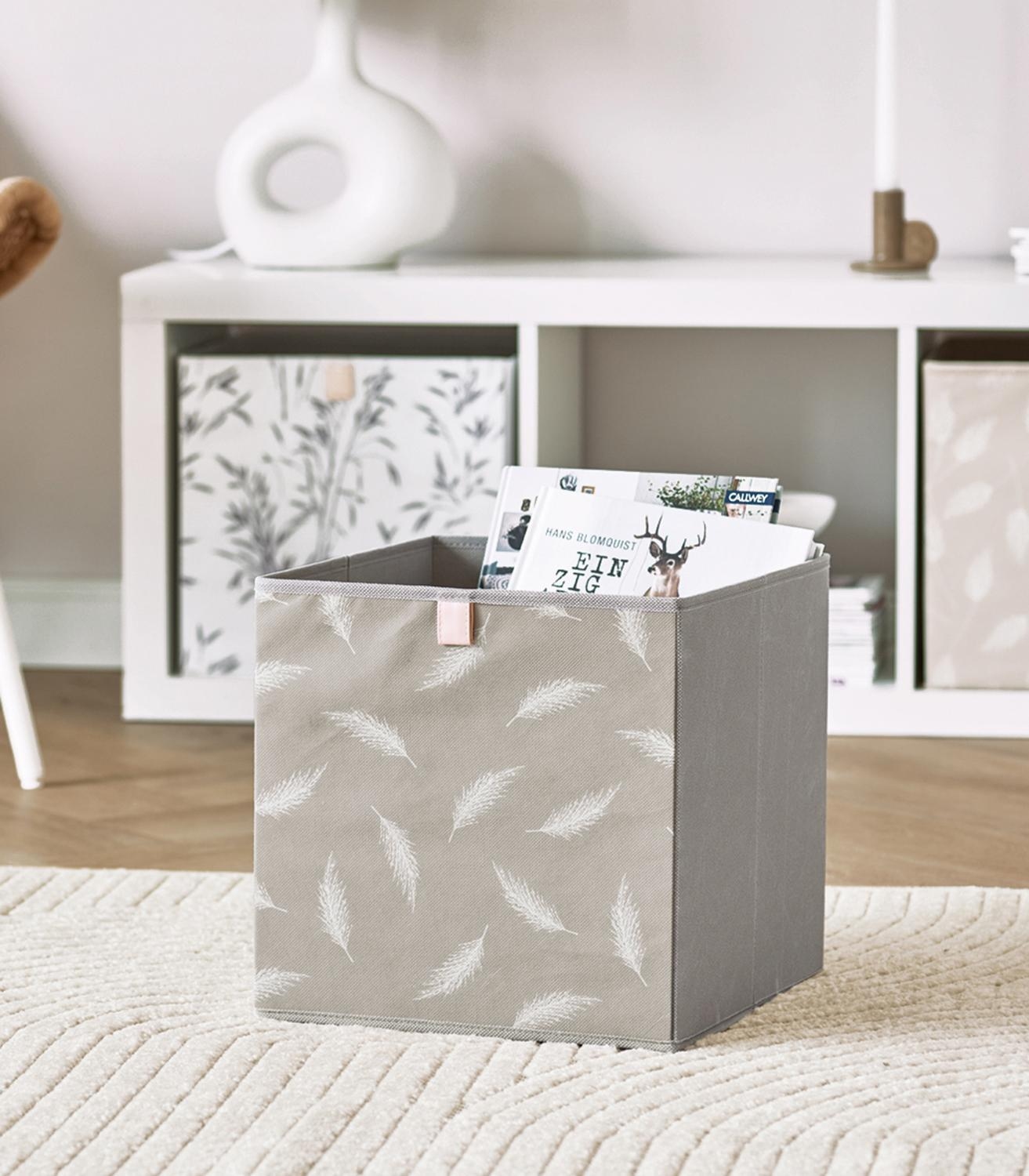 Die Aufbewahrungsbox STELLY von Zeller überzeugt mit ihrem grauen Design und stilvollen Federmotiven in Weiß. Mit einer Größe von 32 x 32 x 32 cm bietet sie praktischen Stauraum für verschiedenste Utensilien. Außen aus robustem Kunststoff und innen mit weichem Vlies ausgekleidet, ist sie funktional und dekorativ zugleich. Die Box wird platzsparend flach verpackt geliefert und ist eine ideale Lösung für Ordnung im Regal oder Schrank – ganz ohne Deckel.
