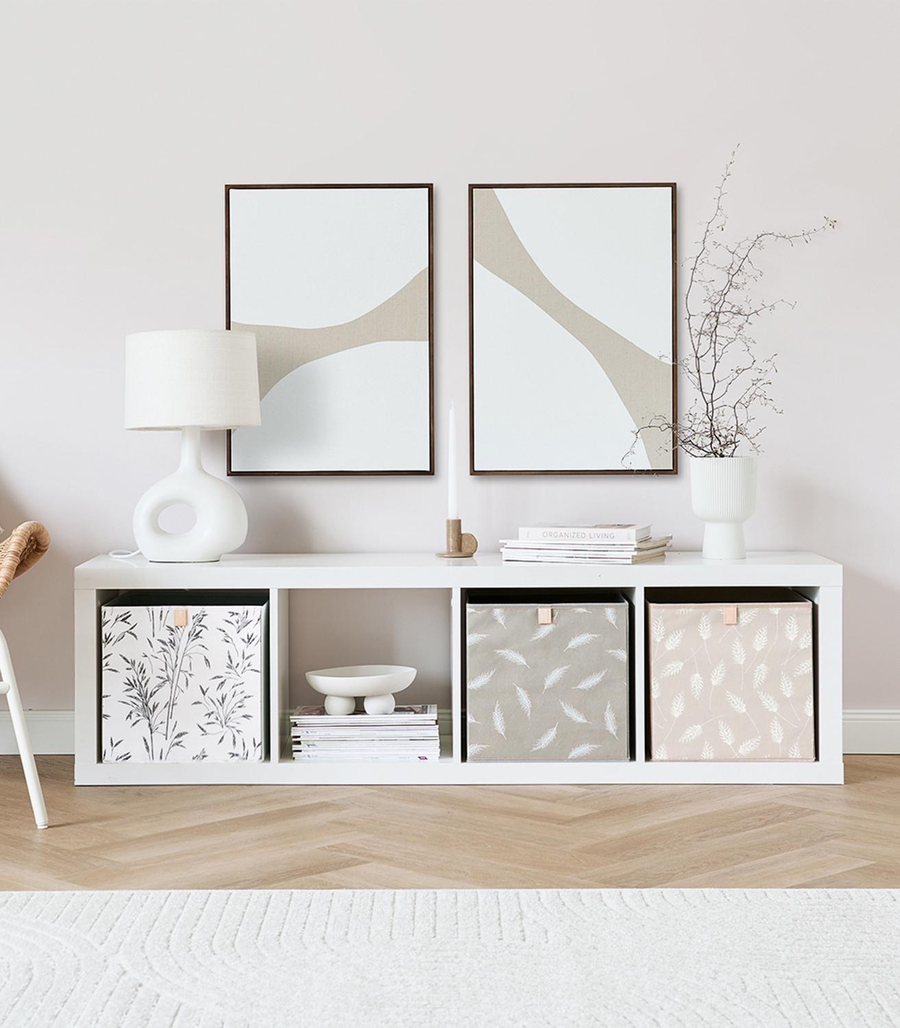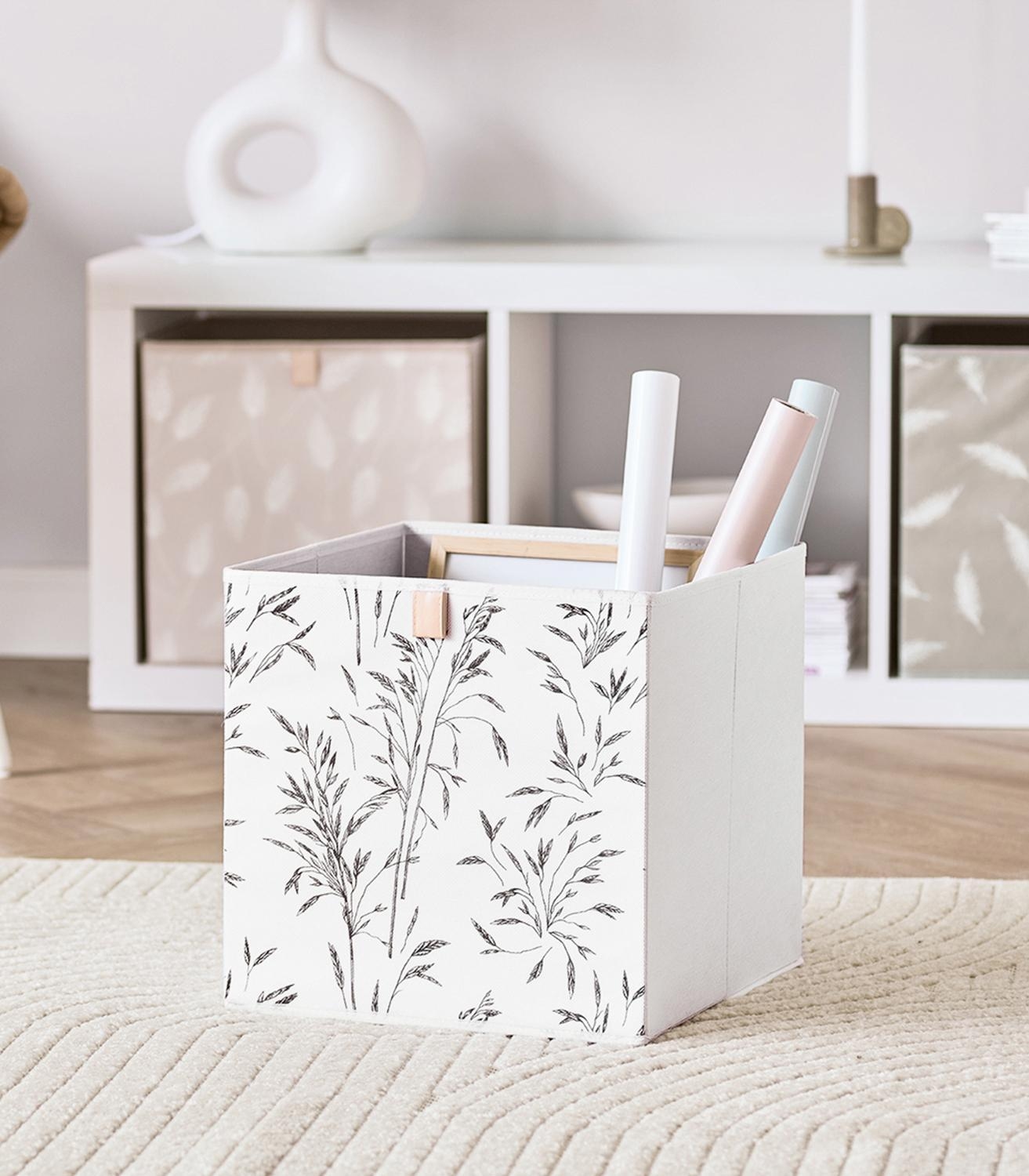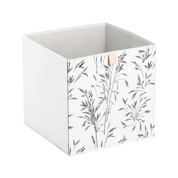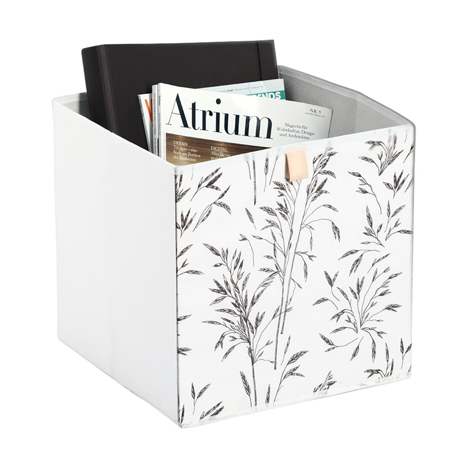 Die Aufbewahrungsbox STELLY von Zeller überzeugt mit ihrem weißen Design und stilvollen Gräsermotiven in Schwarz. Mit einer Größe von 32 x 32 x 32 cm bietet sie praktischen Stauraum für verschiedenste Utensilien. Außen aus robustem Kunststoff und innen mit weichem Vlies ausgekleidet, ist sie funktional und dekorativ zugleich. Die Box wird platzsparend flach verpackt geliefert und ist eine ideale Lösung für Ordnung im Regal oder Schrank – ganz ohne Deckel.