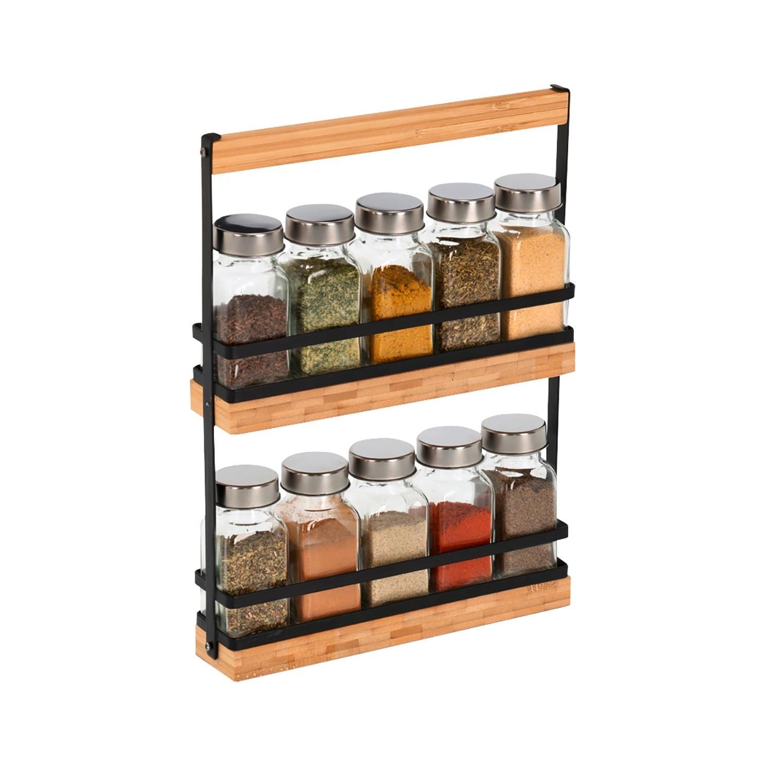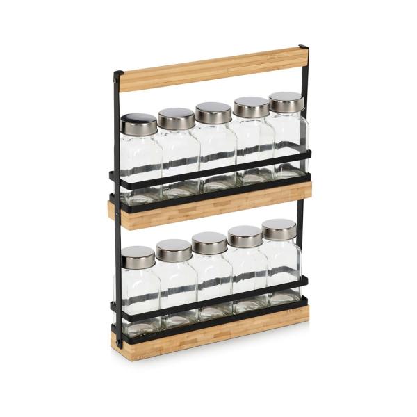 Der zweistöckige Gewürzständer HERBELLA von Zeller kombiniert edles Bambusholz mit robustem Metall und bietet Platz für 10 Gewürzgläser aus Glas mit je 80 ml Fassungsvermögen. Die Gläser sind mit Metall-Deckeln ausgestattet und ideal zur Aufbewahrung von Kräutern und Gewürzen. Mit einer Größe von 22,7 cm Breite, 30 cm Höhe und 4,7 cm Tiefe sorgt der Ständer für eine platzsparende und übersichtliche Organisation in Ihrer Küche.