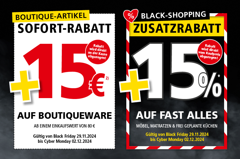 Am großen Black Friday- Wochenende gibt´s dann noch eine BLACK SHOPPING-Aktion on top! Nur von BLACK FRIDAY bis CYBER MONDAY sparen Sie zusätzlich 15% auf Ihren Einkauf in unseren Häusern und wir schenken Ihnen 15€ Rabatt auf Ihren Boutique-Einkauf ab 80€!